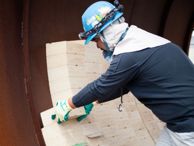 築炉業とは、工業炉の内側に耐火物を施工する仕事です。レンガを積んだり、セメント状のキャスタブルと呼ばれる耐火物を吹き付けたり、型枠を組んで流し込む作業を行います。長期の稼働により摩耗した耐火物の張替えも業務の一つです。